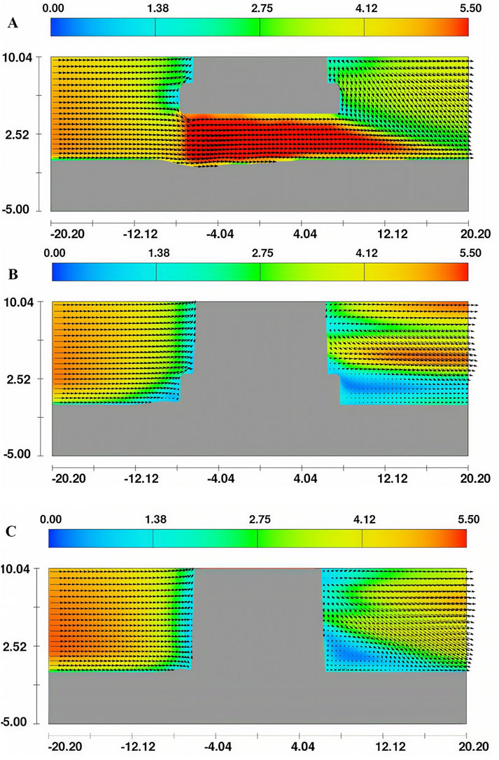 Figure 9. Flow field around the complex pier for pile caps with different relative embedment depths: (A) λ = 1.5 (cap elevated above the bed), (B) λ = 0.0 (cap flush with the bed), and (C) λ = −1.5 (cap embedded below the bed). Flow patterns are shown on the vertical symmetry plane (y = 0), with colors representing the velocity magnitude and arrows indicating the flow direction and strength.