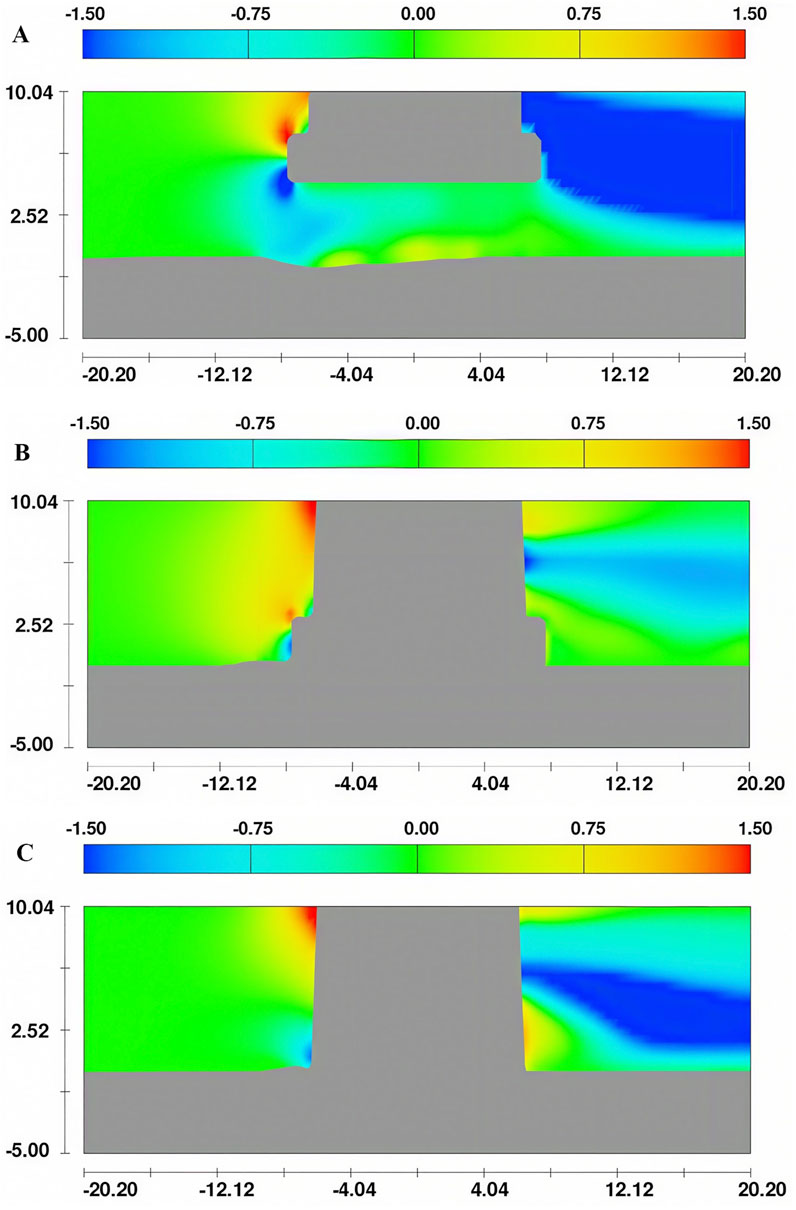 Figure 10. Distribution of vertical velocity around the complex pier for pile caps with different relative embedment depths: (A) λ = 1.5 (cap elevated above the bed), (B) λ = 0.0 (cap flush with the bed), and (C) λ = −1.5 (cap embedded below the bed). Flow patterns are shown on the vertical symmetry plane (y = 0), with colors representing the vertical velocity magnitude.