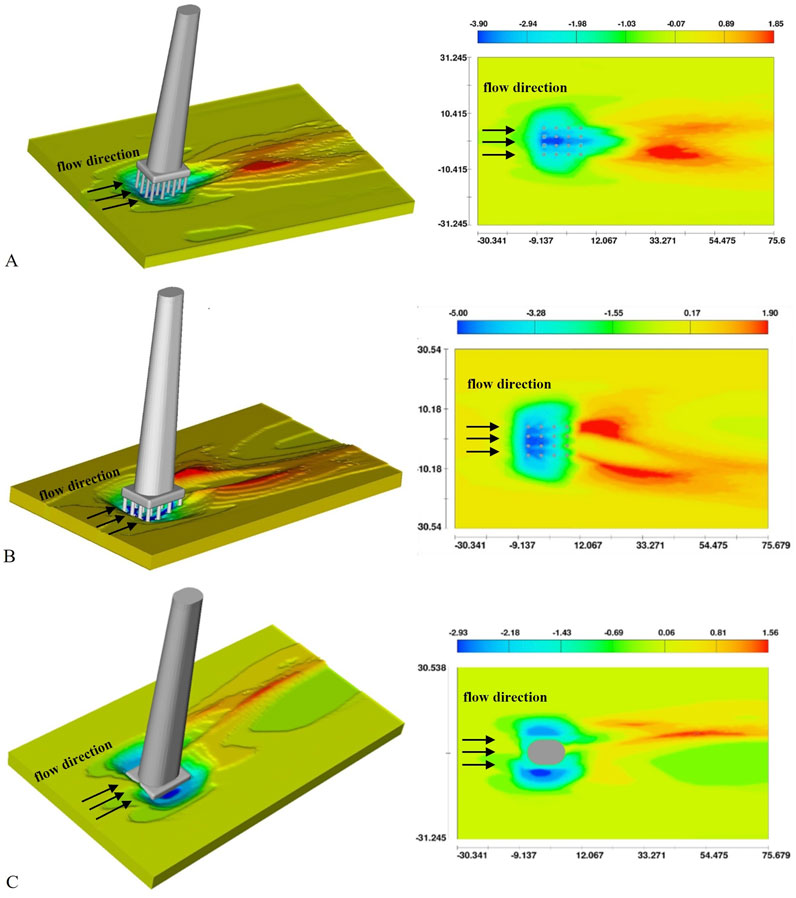 Figure 11. Scour morphology around the complex pier for pile caps with different relative embedment depths: (A) λ = 1.5 (cap elevated above the bed), (B) λ = 0.0 (cap flush with the bed), and (C) λ = −1.5 (cap embedded below the bed). Colors represent the local scour depth, showing the spatial distribution of bed erosion around the pier.