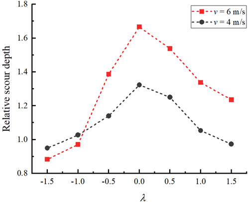 Figure 12 presents the maximum scour depth under different pile cap embedment depths. The results reveal a distinct nonlinear relationship between embedment depth and scour development. As the relative embedment depth of the pile cap decreases from 1.5 to −1.5, the scour depth exhibits a “first increases, then decreases” pattern. When the pile cap is above the riverbed, the scour depth gradually increases as the cap lowers and approaches the bed surface. This occurs because the reduced clearance enhances flow obstruction and disturbance, intensifying bed shear stress and promoting sediment erosion. When the relative embedment depth reaches λ = 0.0 (the bottom surface of the pile cap is flush with the bed), the scour depth attains its maximum value.