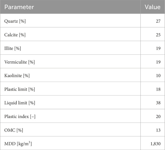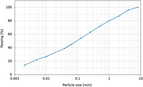 A soil identified as well-graded sand, according to the European Soil Classification System (EN ISO 14688-2 (European Committee for Standardization, 2018)), originating from the municipality of Seggiano (Grosseto, Italy) was used to manufacture the RE samples in this study. The natural soil was passed through an 8 mm sieve to remove the coarser particles, obtaining the particle size distribution shown in Figure 1. This resulting soil contains 14% clay, 31% silt, 42% sand and 13% gravel, in agreement with the recommendations found in several studies about RE (Bui and Morel, 2009; Burroughs, 2010; Corbin and Augarde, 2015; Loccarini et al., 2020; Walker et al., 2005). Table 1 shows the mineralogical composition of the Seggiano soil, evaluated through X-ray diffractometry, including clay minerals identification obtained by the interpretation of the variations of lattice distances related to the basal reflections that occur following specific treatments (Banchellil et al., 1997).