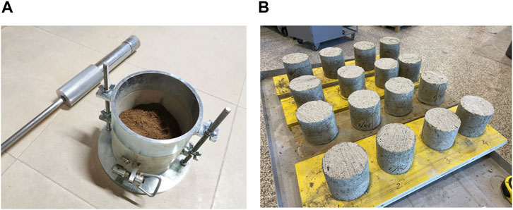 A manufacturing procedure based on the well-known Proctor compaction test was applied (Figure 2A), using a standard cylindrical Proctor mold (ASTM, 2012a) with a diameter of 10.1 cm and a height of 11.5 cm, where the soil was poured and compacted in three uniform layers of ca. 3.4 cm by dropping 25 times per layer a standard Proctor rammer (2.50 kg) from a height of 30.5cm, subjecting the soil to a total compactive effort of about 600 kN m/m3 (ASTM, 2012b). This manufacturing methodology, that allows an accurate control of the compaction process and the compactive energy, has proven to be effective in significantly reducing the dispersion of the results of compression tests (Ávila et al., 2023a), which is typically quite high in studies regarding rammed earth. It is important to note, however, that the slenderness of these samples is lower than the standard ratio of 2.0 typically used in compression tests on cylindrical concrete samples. While this may introduce some variation when comparing the results to those of other studies in the literature, it does not affect the evaluation of the strength improvement assessment due to gypsum addition conducted in this article.