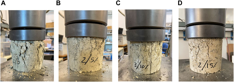 Figure 3. Rammed earth specimens after failure under uniaxial compression tests. (A) U. (B) G5. (C) G10. (D) G15.