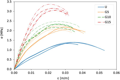 Quasi-brittle materials, like RE, are designed to work mostly under compression, so their uniaxial compressive strength becomes one of the main parameters to characterize their structural capacity. The UCS of the specimens was calculated as the peak load reached at the UCT divided by the cross-sectional area of the sample. As shown in Table 3, the average UCS obtained for the URE samples was equal to 1.4 MPa, and increased with increasing gypsum contents. Thus, the mean UCS was 55% higher for G5 series, 69% for G10 and up to 130% for G15, all percentages calculated with respect to the unstabilized material. A UCS value of 3.2 MPa was reached for 15%-GSRE.