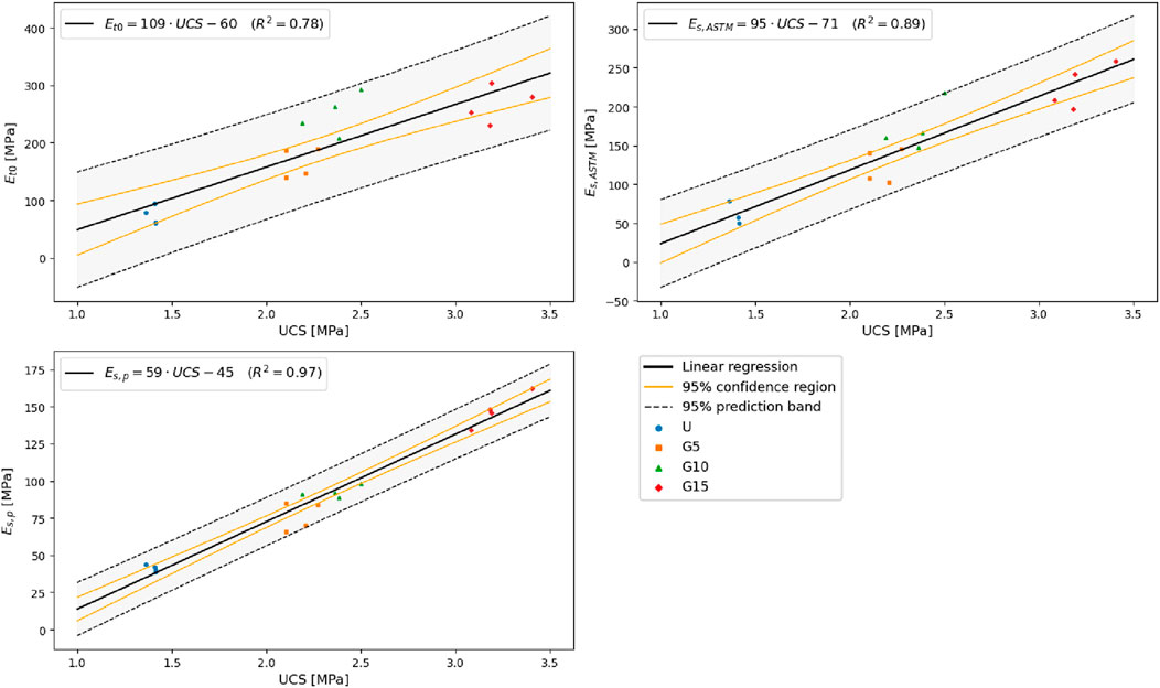 Regarding the relationship between compressive strength and stiffness of RE, it is known that there is indeed a direct relationship between these parameters, but the variability of results in the literature prevents establishing a value of consensus. The Australian standard for RE construction (Walker and Standards Australia, 2002) propose using a value of