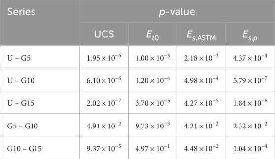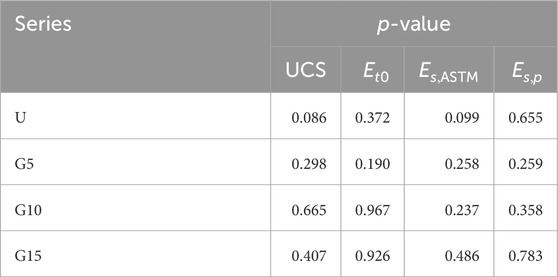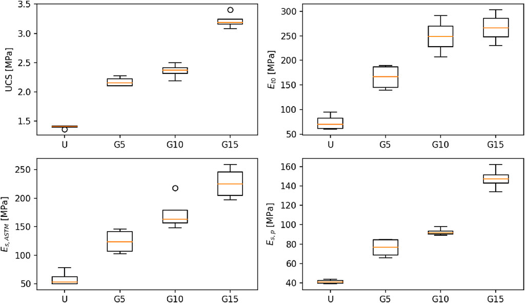 With the aim of verifying the significance of the improvements in the material stiffness, considering the existing dispersion, an analysis of variance was carried out. ANOVA, developed by R. Fisher in 1925 Fisher (1925) is a statistical test used to assess if there is a statistically significant difference between the means of two or more categorical groups. For completeness, the ANOVA was carried out not only for the elastic modulus but also for the UCS, even though the coefficients of variation for this parameter are significantly lower.
