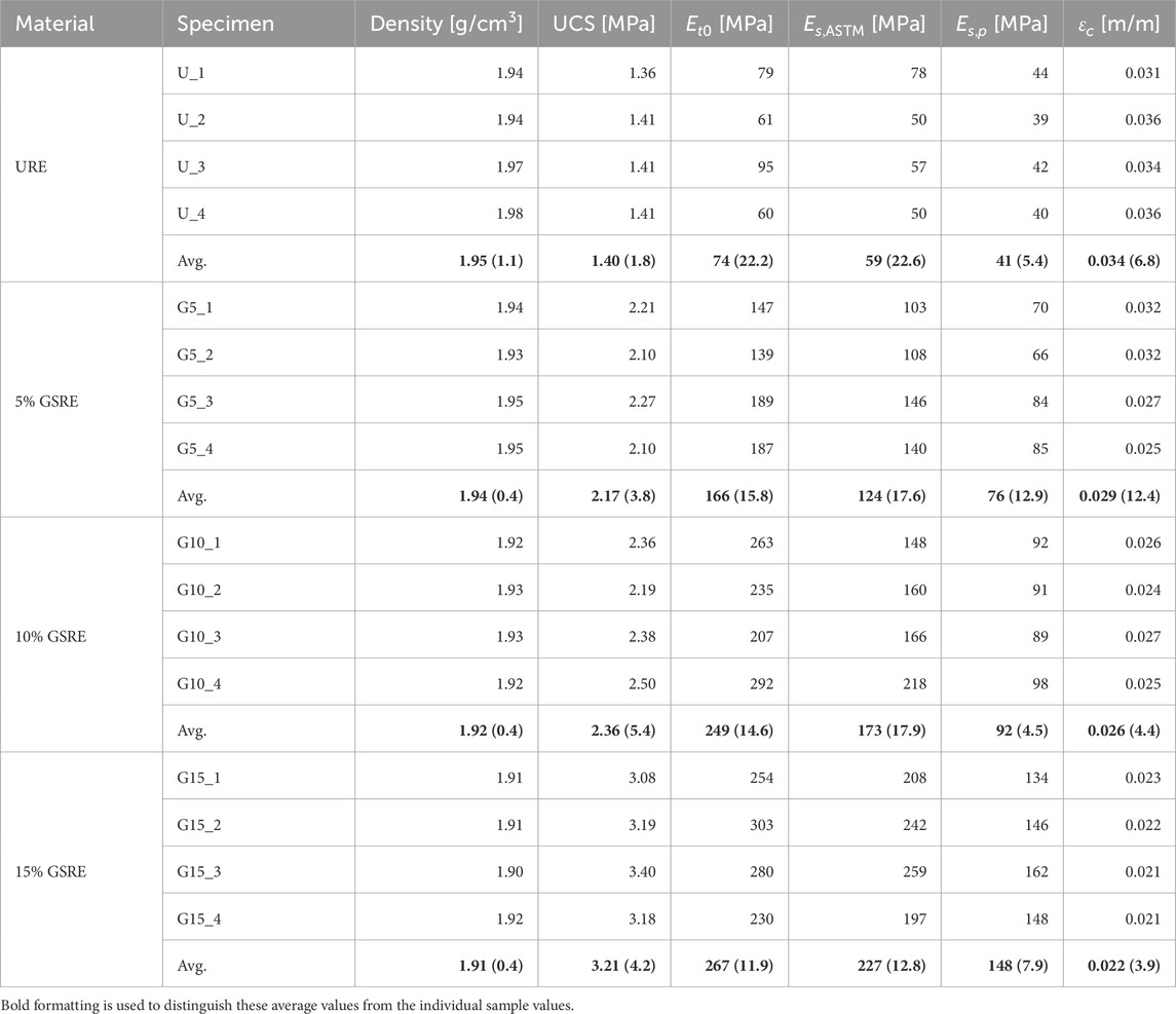 Table 3. Detailed results from uniaxial compression tests performed on the rammed earth specimens. Coefficient of variation [%] in parenthesis.