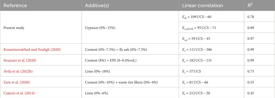 These increases in the elastic modulus are very significant if compared with the results obtained by previous authors using other common stabilizers. The stiffness enhancement for 5% gypsum is much higher than the one obtained using the same percentage of lime in other studies (12%–84%) (Ávila et al., 2022b; Ciancio et al., 2014). It is also higher than the improvements observed for combinations between cement and waste tire textile fibers (22%) (Zare et al., 2020) and similar to the ones obtained by (Koutous and Hilali, 2021) using 6% cement as the stabilizer. Only some few studies present significantly higher improvements of RE stiffness by means of stabilization, using higher amounts of cement (10% cement for a 417% increase in the elastic modulus) (Toufigh and Kianfar, 2019) or a combination of cement and lime (4% of each additive to increase the elastic modulus by 788%) (Hallal et al., 2018).