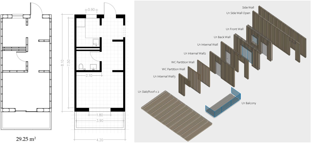 A standard studio unit (Figure 2) was designed and created in both setups. The unit size is 29.25 m2, composed of four main walls, two slab panels, five interior walls, and a balcony. The structure is composed of a light-gauge steel frame, insulated, and covered with plasterboards to meet thermal, acoustic, and fire resistance requirements. A 300 mm grid is used to ensure manufacturing modularity, reducing waste and costs.