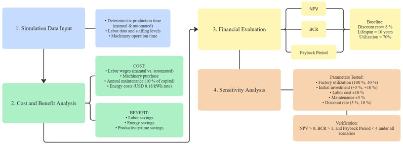 The CBA was conducted using the structure shown in Figure 3. After collecting data, the study analyses production time, labor wages, machinery costs (initial investment), and energy consumption. Afterward, it evaluates the long-term financial viability using Net Present Value (NPV), Benefit-Cost Ratio (BCR), and Payback Period. Finally, it conducts sensitivity analysis using various assumptions on the main financial parameters.