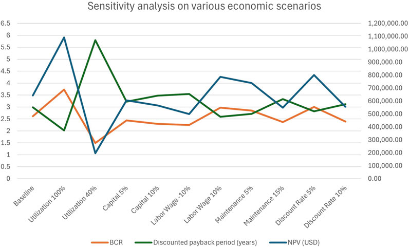 A sensitivity analysis was conducted to evaluate the effect of key parameters on financial outcomes. The analysis varied factory utilization (100%, 40%), initial investment (+5%, +10%), labor cost ±10%, maintenance ±5%, and discount rate (5%, 10%), each at a time while keeping other factors constant (Table 10; Figure 4). Results show that factory utilization has the most decisive influence on project returns: increasing utilization from 70% to 100% raises the NPV from USD 643,693 to USD 1.09 million and the BCR from 2.61 to 3.73, shortening the discounted payback period to about 2 years. At 40% utilization, NPV falls to USD 196,482 and BCR to 1.49, extending payback to nearly 5.8 years. Labor wage variation had a comparable impact: a 10% increase improved NPV to USD 786,691 (BCR 2.97), whereas a 10% reduction decreased it to USD 499,766 (BCR 2.25).