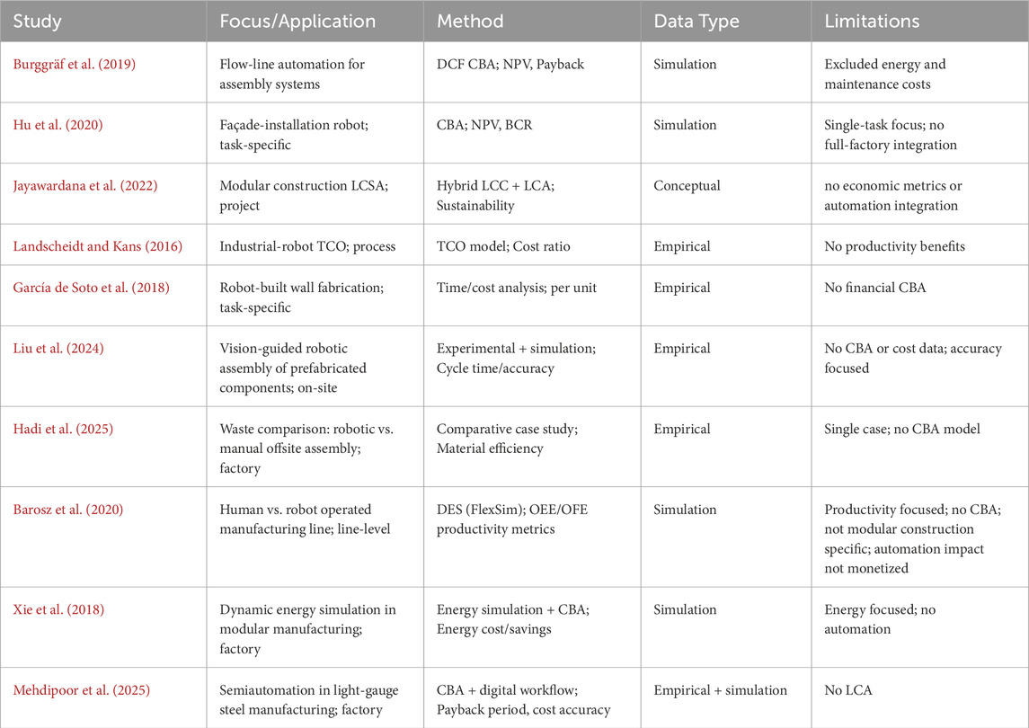 Table 1 summarizes representative studies that have applied CBA or equivalent frameworks to construction automation and prefabrication contexts. Most address individual robotic tasks or conceptual frameworks with limited financial scope. Early deterministic CBAs (Burggräf et al., 2019; Hu et al., 2020) quantified profitability but excluded indirect and energy-related costs. Broader frameworks such as TCO and LCCA (Jayawardana et al., 2022; Landscheidt and Kans, 2016) improved life cycle understanding but remained detached from automation performance data. Task-specific or performance-oriented studies (García de Soto et al., 2018; Liu et al., 2024; Hadi et al., 2025; Barosz et al., 2020; Xie et al., 2018) focused on technical feasibility rather than financial viability. Recent contributions (Mehdipoor et al., 2025) began integrating simulation and economic assessment, but remains scope-limited. These studies collectively reveal that quantitative economic evaluations of process-scale automation linking production simulation with financial metrics are still scarce, particularly in the context of affordable housing modular manufacturing, which remains underdeveloped.