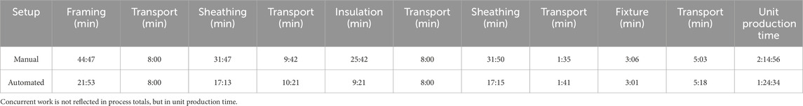Production time is a critical factor in the cost-benefit analysis of modular construction manufacturing. It directly affects labor costs, factory output, and return on investment. Faster production translates into reduced labor hours per unit, shorter project durations, and increased annual output; all of which contribute to the financial viability of automation. Based on the simulation results summarized in Table 2, the automated process completed a studio unit in 1 h 24 min, whereas the manual process required 2 h 15 min. This means automation reduced production time by approximately 37%, enabling higher throughput. This result is similar to the ABB report stating increased production speed by more than 38% (ABB, 2021).