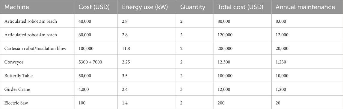Machine acquisition and integration costs form a substantial initial investment in automated modular construction manufacturing. Unlike ongoing labor costs, robot costs are typically capital expenditures with long-term value. In a cost-benefit analysis, it is essential to account not only for the purchase price of robotic systems but also for related expenses such as maintenance and operational energy consumption (Lindborg, 2020). Table 5 outlines the estimated costs of robotic systems used in the automated factory, as well as other machinery used in both setups. Costs were collected through direct quotes from manufacturers, such as ABB, and global suppliers, like Alibaba (X-Tilt Steel Frame, 2025; BOOSTON, 2025; IRB, 2024). The annual maintenance cost was estimated to be 10% of the purchase price (Landscheidt and Kans, 2016). The manual setup would require an investment of USD 124,500 in machinery, while the automatic setup would require USD 524,300 (an additional USD 399,800 for robotic systems). By comparing these costs against labor savings and production gains, the economic feasibility of adopting robotic systems in affordable housing manufacturing can be more accurately evaluated.