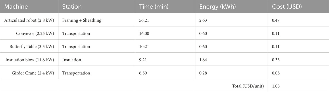 Energy consumption is a critical operational cost that influences the overall economic and environmental performance of modular construction factories. A comprehensive calculation of electricity consumption in a factory would consider direct and indirect uses. Direct uses refer to the energy consumed by equipment that transforms materials into products, such as robots, machines, assembly-line tools, conveyor systems, and crane systems. Indirect uses support infrastructure and operations of the factory but do not directly contribute to the output, including lighting, HVAC systems, material handling, and amenities (Koncz and Gludovatz, 2021). Automated factories generally consume more electricity due to the high-power demands of robotic systems and machinery, whereas manual factories rely more on human labor and have lower direct energy demands. However, automation often leads to faster production cycles, hence, less energy use per module. In this study, energy consumption was calculated based on direct uses and the lighting system alone, as other electricity uses in the factory were not accounted for due to a lack of available data. This means the total energy costs per unit may be underestimated, compared to real-world factory conditions.