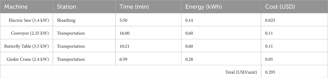 This study uses an international electricity cost rate of USD 0.18/kWh (World Population Review, 2025). Using Equations 1, 2, Tables 6, 7, calculate the energy consumption and cost per unit according to machine use at assigned stations in the automated and manual processes.
