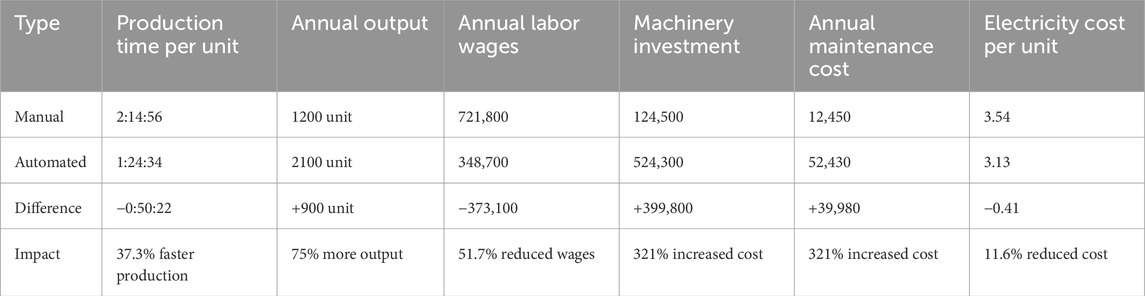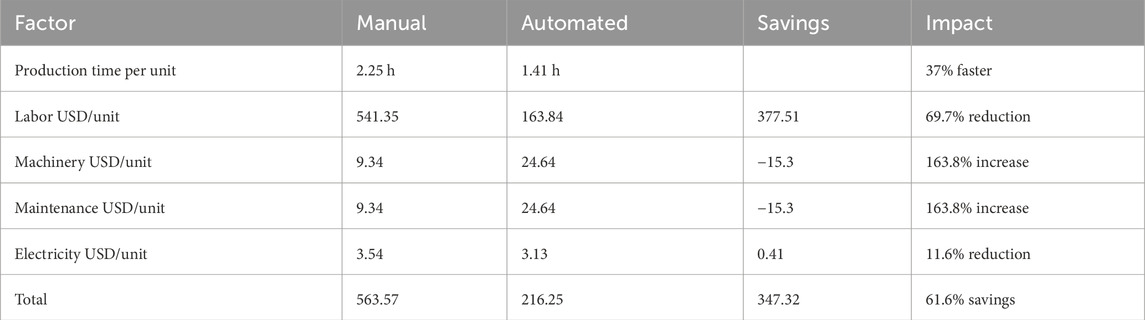 Despite a significantly high initial investment, the automated system demonstrated long-term financial advantages. This study assumes a working schedule of 10 operating hours per day, for 300 working days per year, meaning 3,000 h per year. According to ABB robotics, the expected lifetime of articulated robots is 40,000 h (ABB, 2025). Therefore, the lifetime of a robot would be around 13 years. To simplify the calculations in this study, the operational lifespan is rounded to 10 years. The production time per unit was reduced by 37.3%, with automated assembly taking 1 h 24 min compared to 2 h 14 min in manual operations. This directly translates into increased output capacity and higher productivity. At full capacity, the output is estimated to increase by 900 units, a 75% increase. One of the most notable benefits is in labor wages savings, with annual wages in the automated factory reduced by USD 373,100, approximately 51.7%, from USD 721,800 in the manual setup to USD 348,700. This translates to a 69.7% reduction (USD 377.5 per unit), as calculated using Equations 3, 4. This substantial reduction in human labor not only decreases recurring expenses but also reduces dependency on workforce availability. While automation integration required an investment of USD 399,800, representing a 321% increase, the per-unit machinery cost rose by 163.8%, amounting to USD 15.3, as calculated using Equation 5. This is relatively minor compared to the labor savings. Similarly, the annual maintenance cost increased by USD 39,980, approximately 321%, which translates to a USD 15.3 (163.8%) increase per unit, calculated using Equation 6. In terms of energy consumption, although automated machines operate at higher power levels, their faster production rates reduce electricity cost per unit by USD 0.41 (11.6%), from USD 3.54 per unit in the manual process, to USD 3.13 per unit in the automated process.