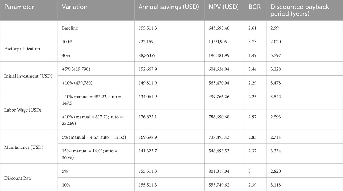 A sensitivity analysis was conducted to test the robustness of the economic evaluation. Key financial parameters, including factory utilization, initial investment, labor wages, maintenance costs, and discount rate, were varied one by one within realistic ranges while keeping other factors constant. The resulting changes in NPV, BCR, and discounted payback period were analyzed to assess how these assumptions influence the overall feasibility of automation.
