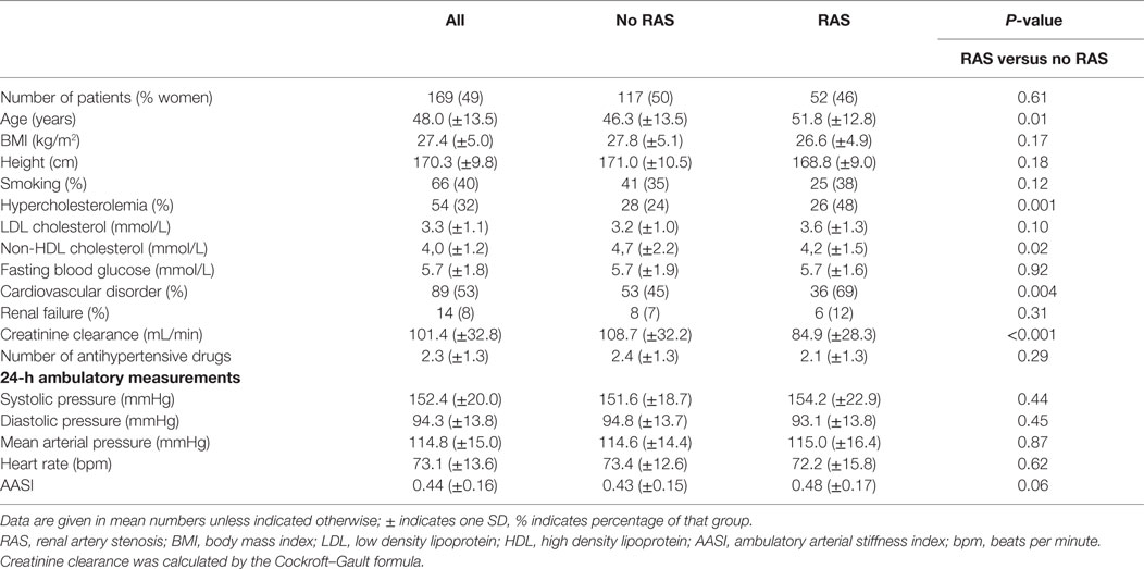An i.a. TCA of the renal arteries was obtained in 129, a CTA in 21, and an MRA in 29 patients. RAS was diagnosed in 52 participants (30.8%), 32 (18.9%) of whom had severe RAS with a luminal obstruction over 50%, and 7 (4.1%) of the entire group with a stenosis had bilateral RAS over 50%. Table 1 lists the main clinical characteristics of subjects with and without RAS.