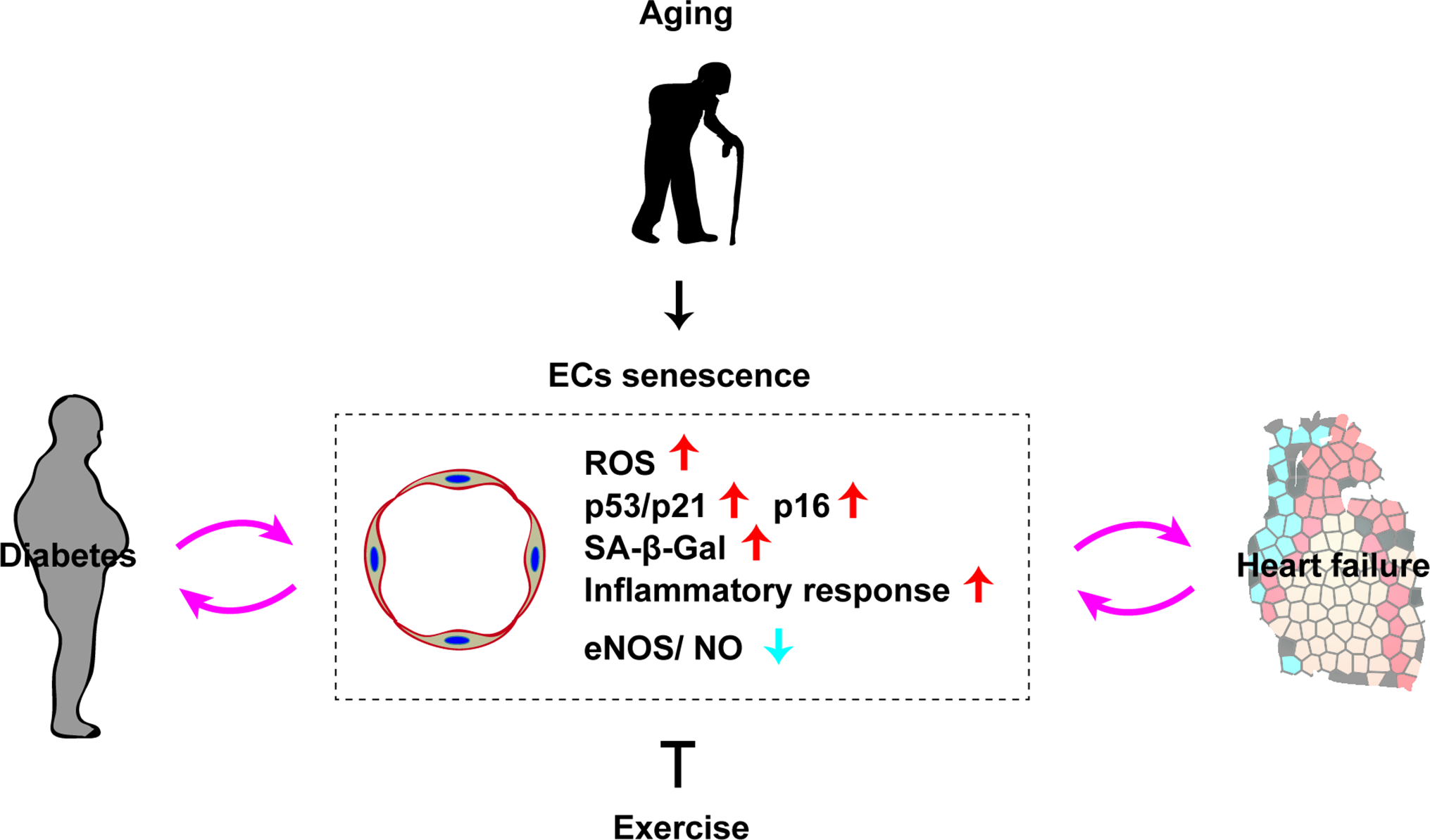 Role of endothelial senescence in cardio-metabolic disease. Chronological aging induces vascular endothelial cell senescence (EC senescence as characterized with an increase of ROS, p53/p21, p16, SA-β-Gal, inflammatory response, and reduced eNOS/NO level). EC senescence has a pivotal role in the progression of diabetes and heart failure. Exercise has a potential to suppress ECs senescence.