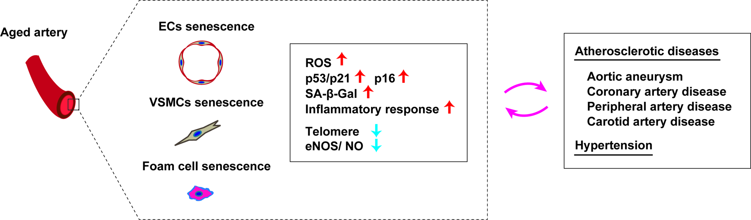 Cellular senescence in aged arteries. Aged arteries are characterized by accumulation of senescent vascular endothelial cells (EC), senescent vascular smooth muscle cells (VSMCs), and senescent foam cells. Accumulation of these senescent cells are associated with an increase of ROS, p53/p21, p16, SA-β-Gal, inflammatory response, telomere attrition and reduced eNOS/NO level). Senescence of these cells promotes pathological changes in atherosclerotic diseases and also has a role in development of hypertension.