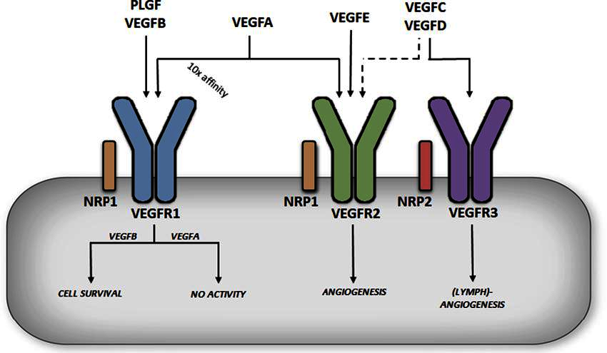 The VEGF family consists of 6 growth factors; VEGFA, VEGFB, VEGFC, VEGFD, VEGFE and placental growth factor (PLGF) (8). These growth factors are able to bind and activate tyrosine kinase receptors called vascular endothelial growth factor receptors, of which there are three major types (VEGFR1-3) (Figure 1). VEGFA is able to bind VEGFR1 and VEGFR2, VEGFB and PLGF can only bind VEGFR1, VEGFC and VEGFD bind to both VEGFR2 and VEGFR3 while VEGFE only binds to VEGFR2. In addition to VEGFRs, there are two co-receptors, Neuropilin-1 (NRP1) and Neuropilin-2 (NRP2) (Figure 1). These co-receptors can bind to VEGFRs to potentiate the latter’s action; some VEGFs can also bind independently to NRPs (9).