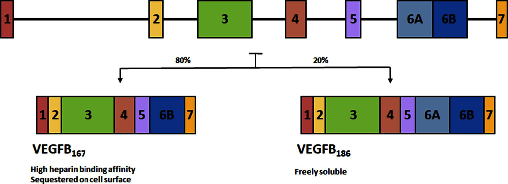 FIGURE 2. Alternative splicing of VEGFB. Alternative splicing leads to two isoforms. VEGFB167 encompasses over 80% of transcripts and contains a highly basic C-terminal heparin binding domain allowing it to be sequestered onto the cell surface. The other isoform, VEGFB186 has a hydrophobic C-terminal making it freely soluble.