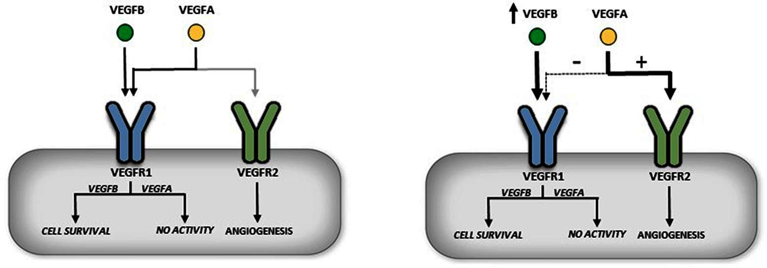 FIGURE 4. Indirect role of VEGFB in angiogenesis. VEGFR1 has a 10× fold greater affinity for binding VEGFA than VEGFR2 (left panel). Overexpression of VEGFB is suggested to occupy and thus displace VEGFA from VEGFR1. This allows more VEGFA to bind to VEGFR2 and can initiate angiogenesis (right panel).