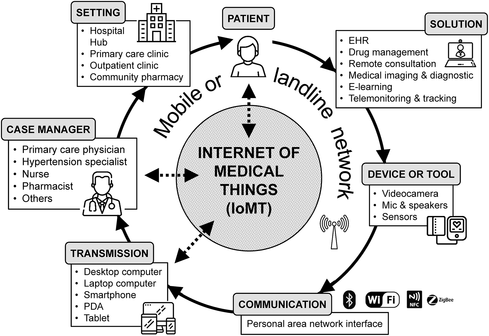 Diagram of most common telehealth services and their workflow. EHR, Electronic Health Record; NFC, Near Field Communication; PDA, Personal Digital Assistant; IoMT, Internet of Medical Things.