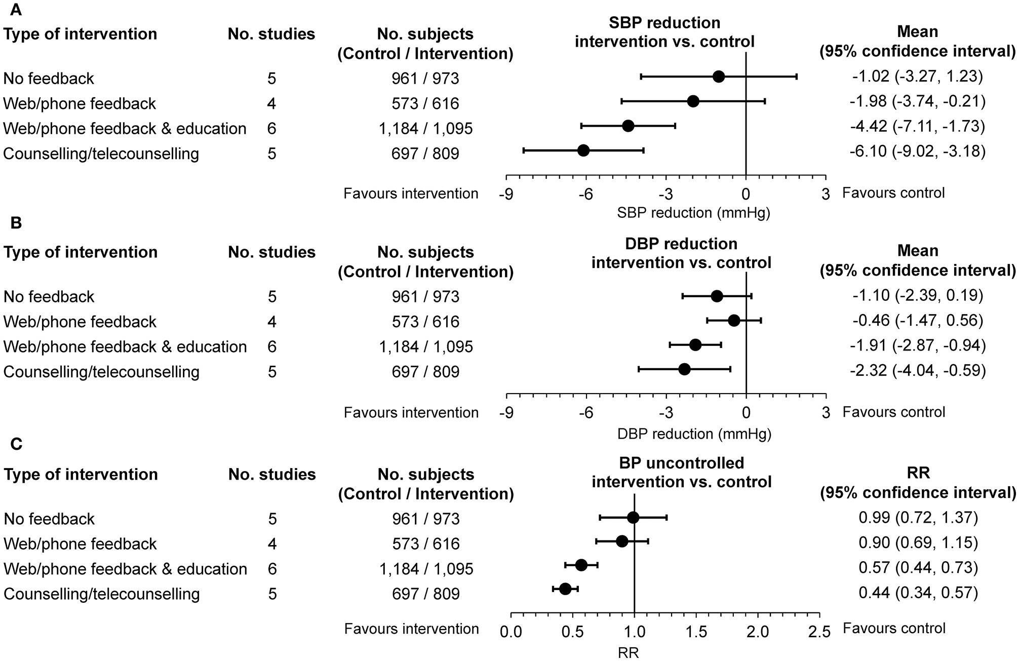 (A) Changes in office systolic blood pressure (SBP) and (B) diastolic blood pressure (DBP) and (C) rates of poor office blood pressure (BP) control at 12 months (intervention vs. usual care serving as control). Data are adjusted for age, sex, baseline clinic BP, and history of diabetes. Differences are shown as mean or relative risk (RR) and 95% confidence interval according to four levels of intervention (self-monitoring of BP with no feedback, self-monitoring with web or phone feedback, self-monitoring with web, or phone feedback and education, self-monitoring with counseling or telecounseling) [from (26) by permission].