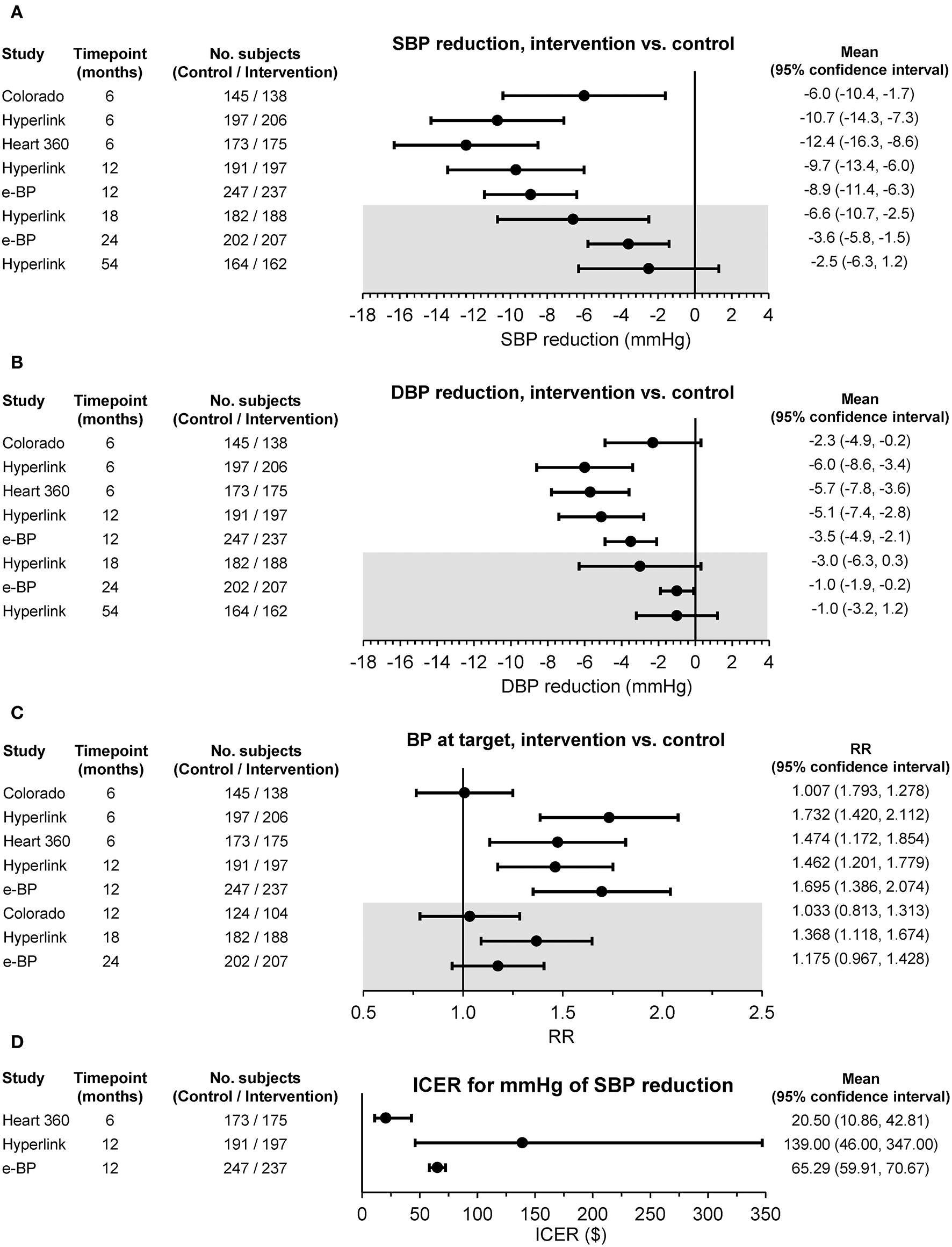 (A) Changes in office systolic blood pressure (SBP) and (B) diastolic blood pressure (DBP), (C) percentages of subjects with office blood pressure (BP) at target, and (D) incremental cost-effectiveness ratio (ICER) between the intervention and usual care group in randomized controlled studies based on pharmacist-led telehealth care. Differences are shown as mean or relative risk (RR) and 95% confidence interval at different time points. The gray insert refers to the period of the study following the withdrawal of the intervention [from (32) by permission].