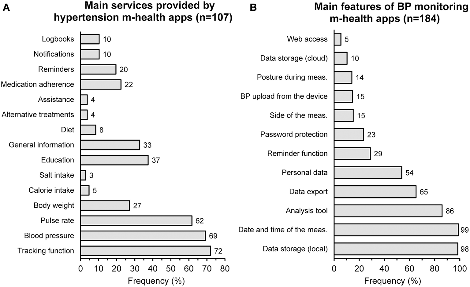 Main services provided by hypertension m-health apps according to a survey of 107 different products (A) and main characteristics of m-health apps used for blood pressure (BP) monitoring according to another survey of 184 applications (B) [redrawn from (52) and (53) by permission].