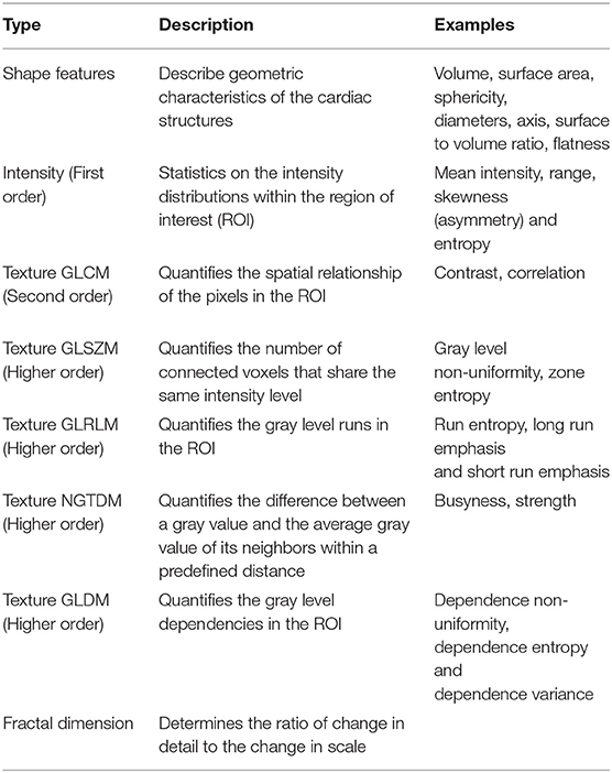 Radiomics analysis is the process of converting digital images to minable data. Analysis of the data through application of various statistical and mathematical processes allows quantification of various shape and textural characteristics of the image, referred to as radiomics features (Table 3). Radiomics analysis quantifies more advanced and complex characteristics of the cardiac chambers than is visually perceptible. Similarly to clinical imaging indices, radiomics requires the delineation of the cardiac structures before the features can be extracted.