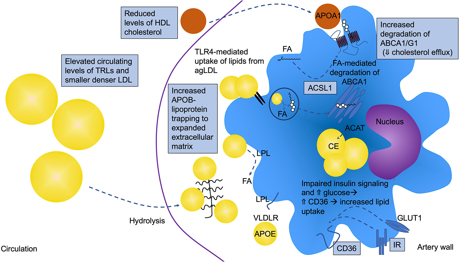 Altered macrophage lipid handling is critically involved in diabetes-accelerated atherosclerosis. Under diabetic conditions, macrophages are often lipid loaded and contain increased levels of cholesteryl ester (CE) in lipid droplets. T2DM and poorly controlled T1DM are associated with elevated circulating levels of triglyceride-rich lipoproteins (TRLs), which contribute to macrophage lipid loading, but the increased lipid loading can also be in part due to increased retention of atherogenic lipoproteins in the artery wall, such as LDL, VLDL, and remnant lipoprotein particles (RLPs). These APOB-containing lipoproteins can bind the expanded/altered extracellular matrix present in lesions in diabetes. Diabetes also alters the balance between uptake and efflux of lipids by modulating the levels of receptors and transporters involved in cholesterol and fatty acid uptake and efflux. CD36 and very low-density lipoprotein receptor (VLDLR), in addition to other receptors and mechanisms, mediate lipid uptake while ATP-binding cassette transporter A1 and G1 (ABCA1 and ABCG1) are critical mediators of cholesterol efflux to HDL and APOA1. ABCA1 and CD36 have been shown to be reduced and elevated, respectively, under diabetic conditions. Fatty acids have been demonstrated to mediate increased degradation of ABCA1 through a mechanism dependent on ACSL1. Impaired insulin signaling via the insulin receptor (IR) and elevated glucose can lead to increased CD36 levels. Furthermore, the elevated levels of TLR4 might result in increased uptake of lipids from aggregated LDL (agLDL), further contributing to the increased lipid loading. Lipoprotein lipase (LPL) aids in the hydrolysis of TRLs, generating free fatty acids (FA) that are easily taken up by cells. All of these pathways can be altered by the diabetic environment as indicated in the schematic by boxes, resulting in lipid accumulation and a pro-atherogenic macrophage phenotype.