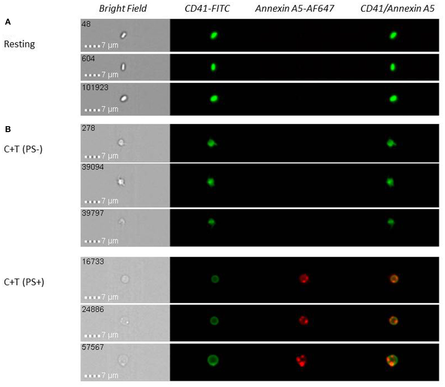 Upon platelet activation with collagen (10 μg/ml) + thrombin (1 U/ml) (C + T), a subpopulation of phosphatidylserine (PS)-exposing platelets with a round, balloon-like morphology and one or more associated extracellular vesicles (EVs) is formed. Resting (unstimulated) (A) or stimulated (B) washed platelets were labeled with anti-CD41-FITC (platelet marker) and annexin A5-Alexa Fluor 647 (PS exposure) and analyzed on an Amnis ImageStreamX Mark II (ISX) multispectral imaging flow cytometer. Images representative of n = 4 independent experiments.