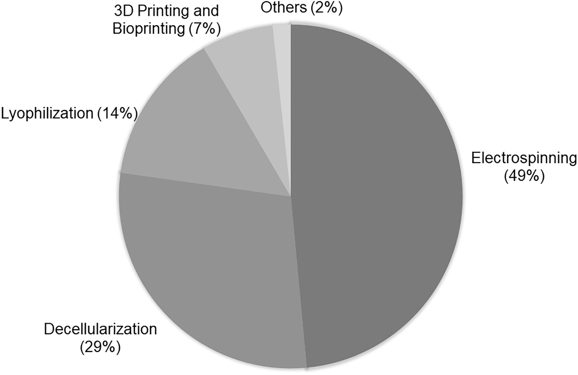 In accordance with a search realized in PubMed for the terms “tissue engineering and vascular grafts,” it is verified that most vascular scaffolds have been obtained by electrospinning, decellularization, lyophilization, and 3D printing and bioprinting (Figure 2).