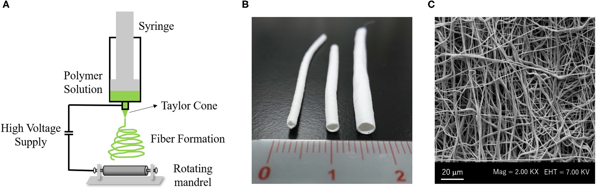 Electrospinning system to create a vascular graft: (A) Electrospinning machine consists of a syringe with a needle attached to its tip connected to an electrode, with a high voltage supply and a rotating mandrel as collector plate. (B) Macroscopy aspect of PCL vascular graft with small diameter (Left: 1 mm inner diameter, Middle: 2 mm inner diameter, Right: 3 mm inner diameter). (C) Scanning electronic microscopy (SEM) image of PCL electrospun fibers. All Images are provided from the authors.