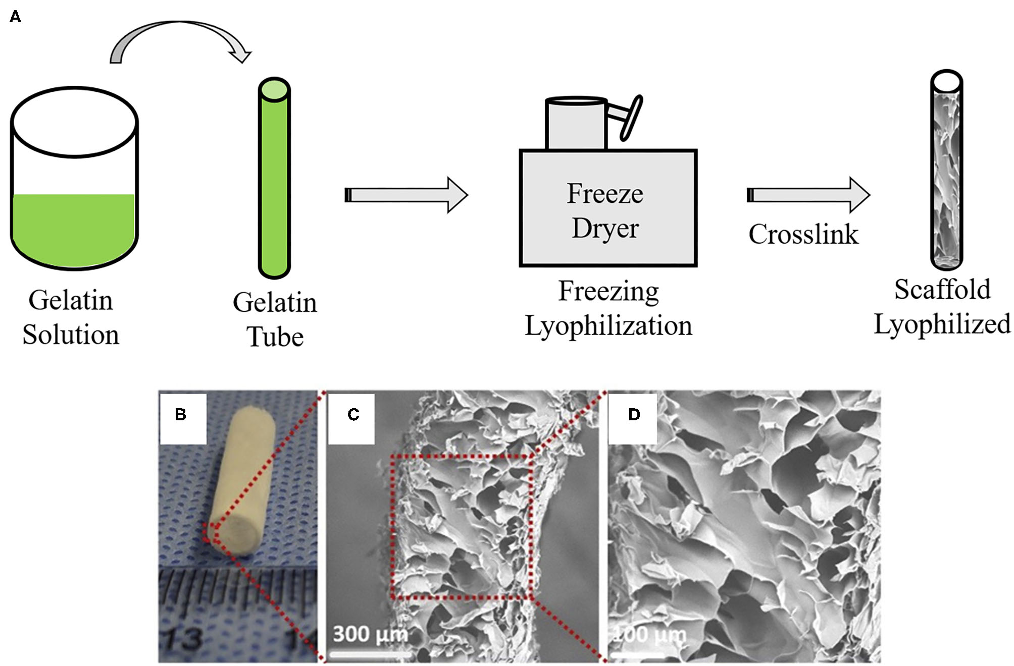 Vascular graft developed by lyophilization: (A) Schematic overview of lyophilization method to create gelatin-base vascular graft. Gelatin gel solution material is loaded into a mold cylinder and then freezing and lyophilization are performed using a freeze dryer. Remaining is a lyophilized scaffold. (B) Macroscopic appearance and (C,D) SEM images of vascular graft made by a lyophilization method. The images are adapted from a report by Yao et al. (68).
