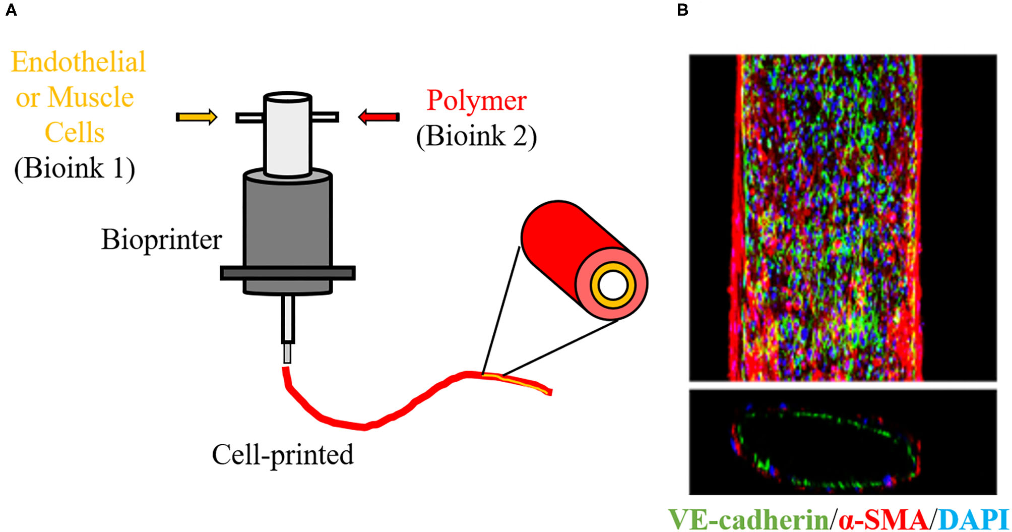 3D Bioprinter. (A) Schematic overview of 3D cell printing technique to create a vascular graft using bioinks. 3D bioprinter deposit polymers with living cells layer-by-layer in a desired structure, allowing to create a vascular architecture with endothelial and smooth muscle layers. (B) Immunofluorescence staining image show that a 3D-bioprinted vascular graft is constructed of endothelial cells (green) and smooth muscle cells (red). Blue indicates nuclear. The image is adapted from a report by Gao (76).