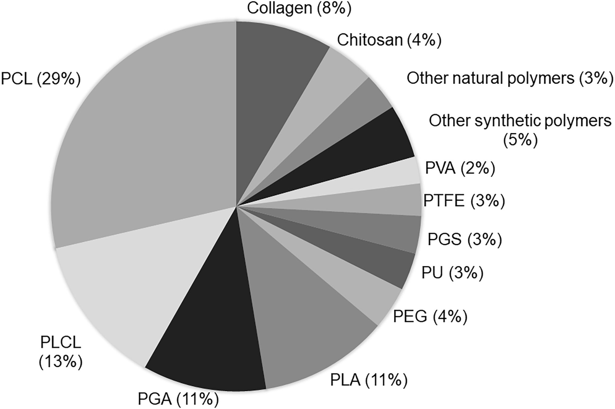 Current biomaterial polymers used to produce vascular scaffolds: The term “tissue engineering and vascular grafts” was used in the PubMed search. The number of papers using each polymer in the last 5 years was calculated. The analysis was based on the reading of the title and/or abstracts of original papers.