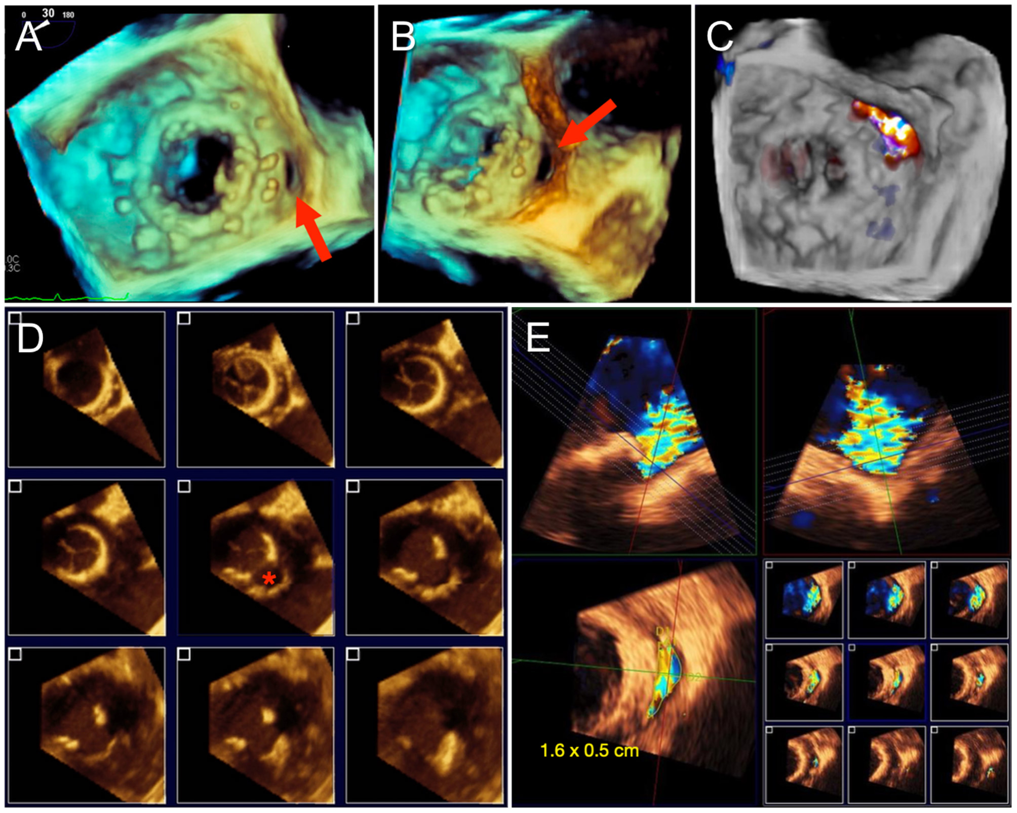 Paravalvular mitral regurgitation assessment by TEE. (A) 3D en face “surgeon's view” of a mitral bioprosthesis demonstrates a gap along the posteromedial aspect, corresponding to a paravalvular defect. (B) Rotation of the 3D volume improves visualization of the paravalvular defect. (C) Color Doppler confirms regurgitant flow through the defect and no other areas of paravalvular leak (PVL). Sizing of PVL by TEE can be difficult due to irregularity in the shape of the defect and dropout artifact, as shown in (D), and is best measured with color Doppler to delineate the regurgitant PVL jet and avoid overestimation (E).