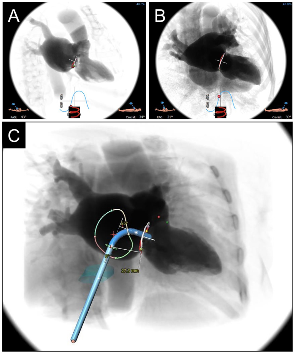 CCTA-based Fluoroscopic Simulation for TMVR access planning. Projected Fluoroscopic coplanar angles can be found along the displayed S-curve. A coplanar working view (A) and modified 4-chamber view (B) are displayed for a planned valve-in-ring procedure. (C) Full transseptal access planning is shown, with a projected catheter path through the IVC (turquoise cylinder) and across the interatrial septum for coaxial valve implantation from the working view. Catheter bend angle is displayed (85 degrees) and ideal entry distance from the mitral annulus (27.3 mm).