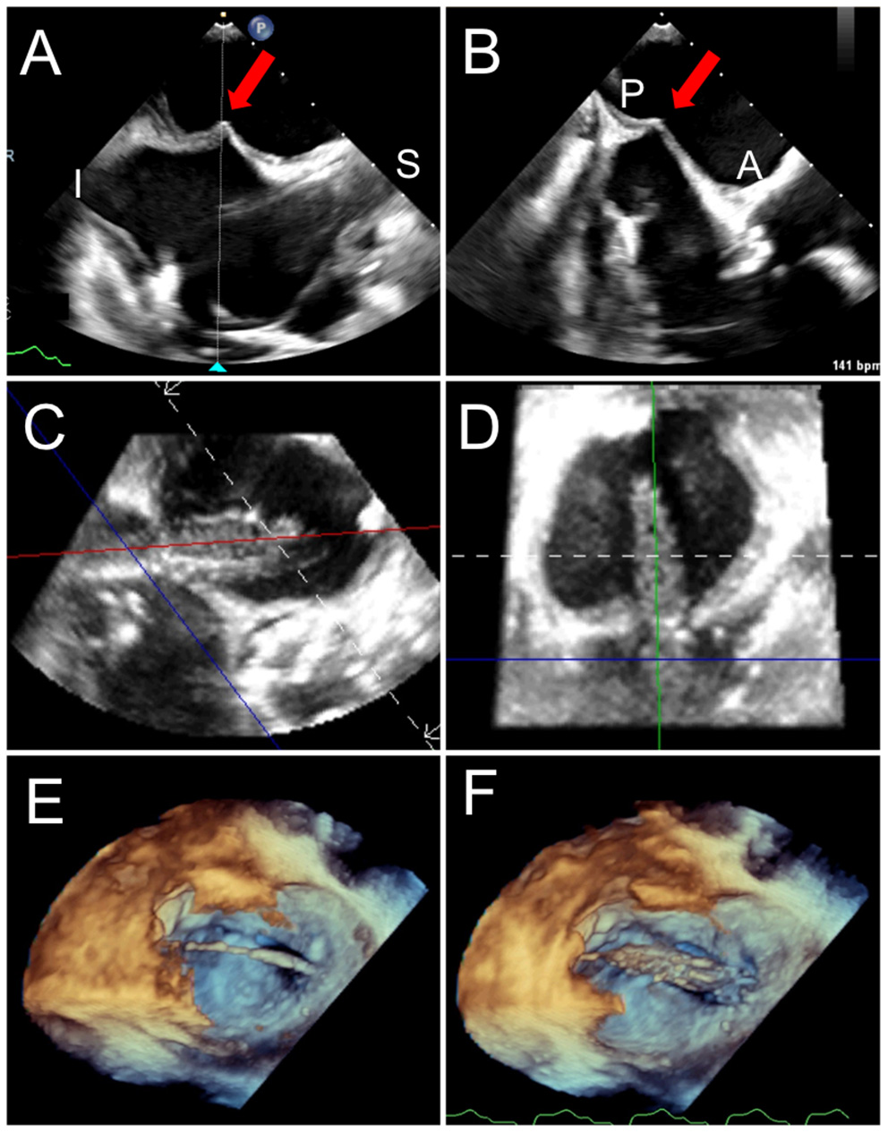 Trans-septal puncture and septostomy for TMVR. A transseptal needle is seen tenting the interatrial septum (red arrows), best assessed utilizing biplane TEE imaging in the bi-caval (superior-inferior, A) and short-axis (anterior-posterior, B) views to confirm positioning in the inferior and posterior aspect of the fossa ovalis. After a successful transseptal puncture, a balloon is advanced over a stiff wire, and proper positioning across the septum can be verified utilizing live 3D MPR (C,D). (E) The balloon is visualized in a 3D zoom volume-rendered image from the left atrial perspective. (F) The balloon is inflated for atrial septostomy in order to later accommodate the large crimped TMVR device. Supplementary Video 1 illustrates balloon inflation for atrial septostomy, as seen from the left atrium.