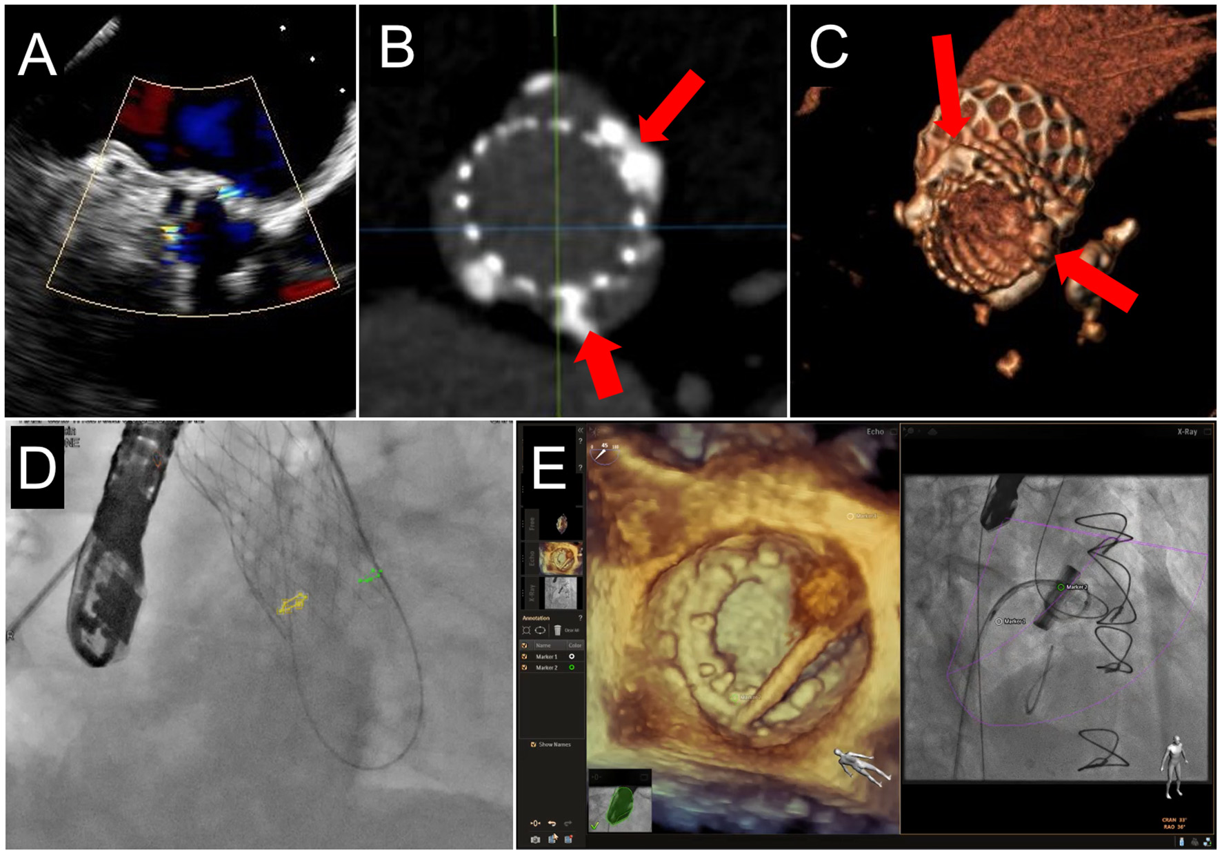 Fusion Imaging. 2 PVL jets are seen on TEE color Doppler imaging in a patient who had previously undergoing TAVR (A). These were anatomically located on subsequent CCTA (B,C, red arrows) and co-registered onto fluoroscopic procedural imaging (D, yellow and green circles). (E) A mitral PVL closure using live TEE fusion imaging for co-localization.