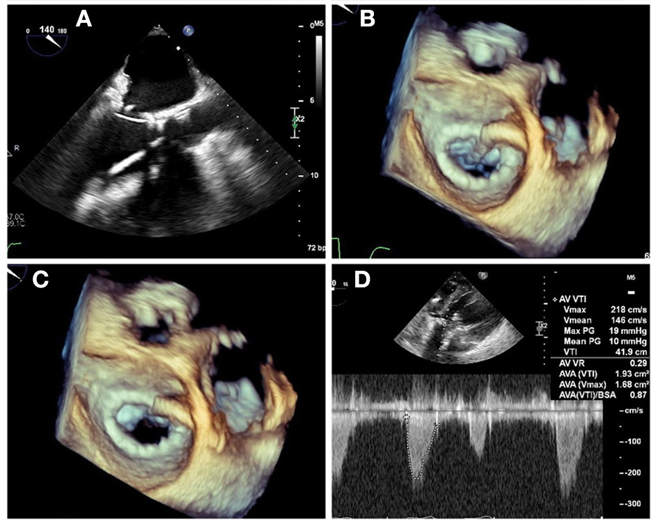 Given the significant risk for LVOTo, particularly with a valve in a native annulus, it is imperative to carefully assess LVOT flow and gradients after device deployment. In addition to a mid-esophageal long-axis view for color Doppler assessment, evaluation of LVOT gradients is best achieved by PW Doppler interrogation from a deep trans-gastric view. MPR of a high-quality 3D TEE dataset can be utilized to measure the resultant neo-LVOT area. However, acoustic shadowing is a limitation of TEE visualization, and there may be a role for TEE-CT fusion for neo-LVOT assessment (52).