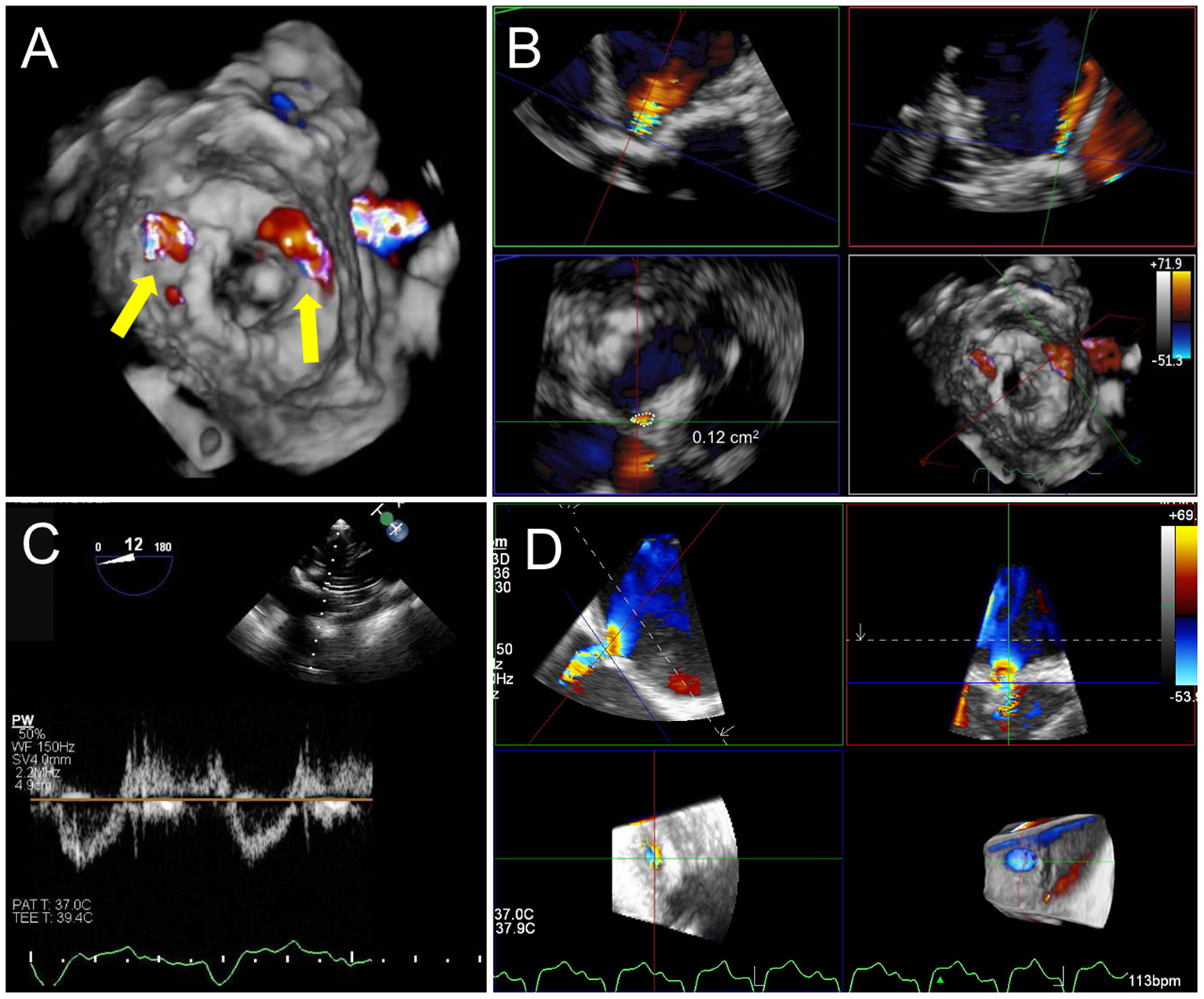 Post TMVR assessment immediately after deployment. (A) 3D color Doppler evaluation from an en-face surgeon's view immediately after a valve in MAC implantation reveals two areas of paravalvular leak (PVL) at 10 and 1 o'clock (yellow arrows). See Supplementary Video 3 for 3D en face evaluation of valve morphology and leaflet motion. (B) Careful interrogation of the largest area of PVL with 3D MPR reveals a vena contracta area of 0.12 cm2. (C) Pulsed-wave Doppler interrogation of the LVOT from a transgastric view in order to exclude a significant gradient or obstruction. (D) Evaluation of residual iatrogenic septal defect size and direction of flow.