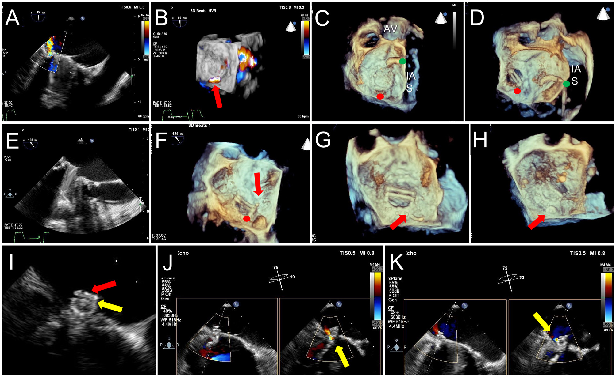 TEE Guidance of Challenging Closure of Posteromedial PVL. A posterior paravalvular leak resulting in hemolysis is visualized by 2D color Doppler (A) and 3D color Doppler Imaging (between 5 and 6 o clock in a surgeon's view, red arrow, B). (C) The first attempt at transseptal puncture is shown (green circle). The location of PVL is marked by a red circle. (D) After unsuccessful attempts to cross the defect, the septum was repunctured more posterior (green circle) for a better trajectory toward the defect. (E) After additional unsuccessful attempts, the approach was changed to retrograde. (F) As acoustic shadowing limits visualization on the ventricular aspect of the mechanical mitral prosthesis, wire exit point was visualized in the left atrium. Here, the wire is visualized inside the sewing ring (red arrow) adjacent to the PVL (red circle). (G) After reorientation of the wire, the defect was successfully crossed (red arrow). (H) The atrial disk of an AVPII closure device is visualized after deployment on 3D imaging (red arrow). (I) 2D echocardiography demonstrates the atrial disk (red arrow) and a portion of the center cylinder (yellow arrow). (J) A residual peri-device jet is seen (yellow arrow). (K) After device re-sheathing and slight repositioning, there is a trivial residual PVL jet flowing through the center of the closure device (yellow arrow). AV, aortic valve; IAS, interatrial septum.