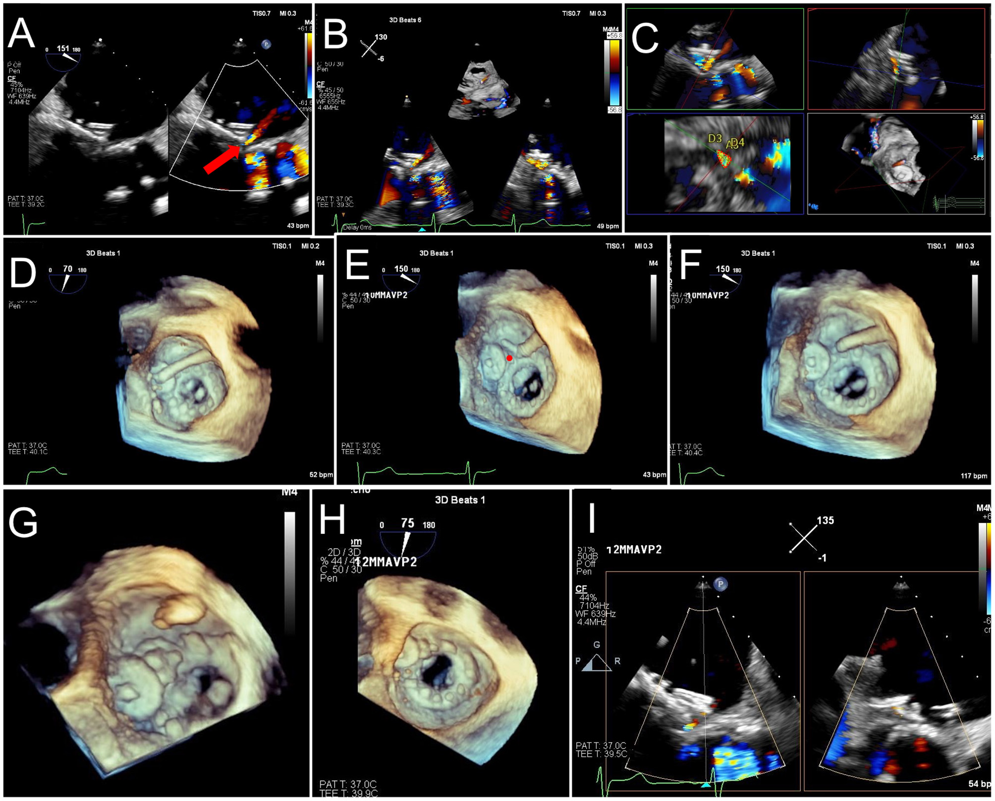 TEE Guided Implantation of a Second PVL Closure Device for Residual Leak. (A) After an initial deployment of a 10 mm AVPII device, a residual leak is seen adjacent to the first device (red arrow). (B) A sector-based 3D Color Doppler acquisition demonstrates the location of the residual leak medial to the first device. (C) Multiplanar reconstruction of the 3D color Doppler acquisition is aligned with the jet for measurement of the paravalvular defect (lower left panel, dotted red tracing), measuring 17 mm2, with dimensions 10 x 4 mm. (D) The guide catheter is positioned on top of the first device, too lateral to enter the defect. (E) The guide is pulled back, and wire crossing of the defect (red circle) is attempted. Wire trajectory is medial and anterior to the defect. (F) After correction of wire trajectory, the defect is crossed. (G) A 12 mm AVPII device is deployed within the residual defect. (H) Bioprosthetic leaflet opening appears normal, without interference from the closure devices. (I) Biplane color Doppler imaging demonstrates trivial residual leak after deployment of the 2nd PVL closure device.
