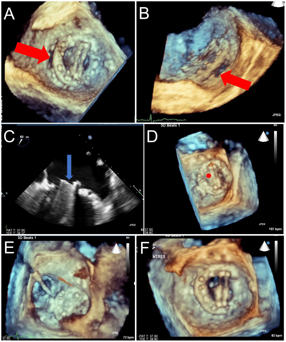 Prosthetic Mechanical Leaflet Dysfunction Following PVL Closure. A large lateral paravalvular defect is seen (red arrows) from the surgical (A) and lateral (B) view. While initial deployment was successful, once the closure device was released from the delivery system, the lateral mechanical leaflet no longer opened during diastole due to interference from the ventricular aspect of the closure device (C, blue arrow, and D, red circle). After snaring to remove the closure device (E), leaflet motion returned to normal (F).