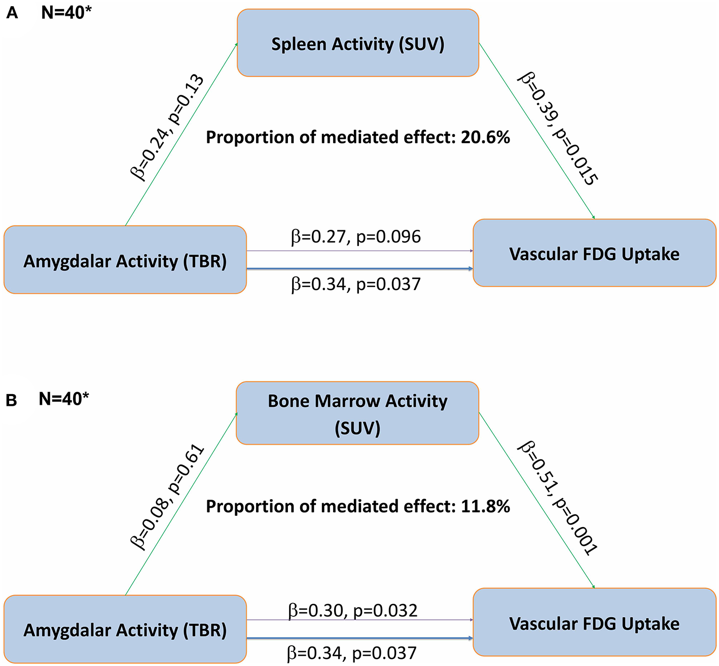 Regression modeling that examined the relationships between hematopoietic tissue activity and aortic vascular FDG uptake revealed that for every unit increase in bone marrow activity, there was a 0.51-unit increase in aortic FDG uptake (p = 0.001). For every one-unit increase in spleen activity, there was a 0.39-unit increase in aortic FDG uptake (p = 0.015) (Table 3). Furthermore, in mediation analyses, we found that splenic activity partially mediated the association between AmygA and aortic vascular FDG uptake, accounting for 20.6% of the relationship (Figure 1A). We also demonstrated that bone marrow activity accounted for 11.8% of the relationship between AmygA and aortic vascular FDG uptake (Figure 1B).